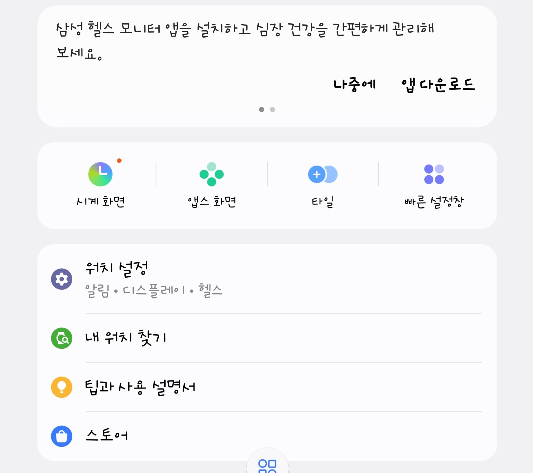 * 앱 설치: 스마트폰의 앱 스토어(Play 스토어 또는 Galaxy Store)에서 'Galaxy Wearable' 앱을 검색하여 설치합니다.