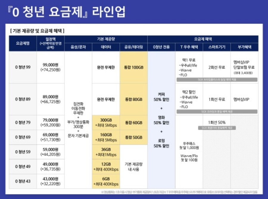 0 청년 요금제는 기존 24세까지 해당하던 청년기준을 34세 미만까지로 폭넓게 지원하며 요금제에 주던 혜택은 그대로 주면서 데이터를 추가로 더 주고, 테더링/공유데이터도 업그레이드, 커피쿠폰할인, 영화할인, 로밍 할인등을 추가로 넣어 주고 있으니 청년이라면 바꾸지 않을 이유가 없겠습니다.